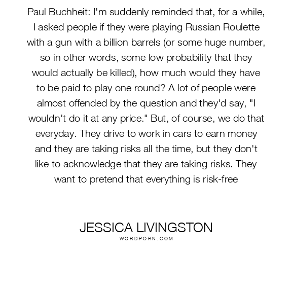 Paul Buchheit: I'm suddenly reminded that, for a while, I asked people if they were playing Russian Roulette with a gun with a billion barrels (or some huge number, so in other words, some low probability that they would actually be killed), how much would they have to be paid to play one round? A lot of people were almost offended by the question and they'd say, "I wouldn't do it at any price." But, of course, we do that everyday. They drive to work in cars to earn money and they are taking risks all the time, but they don't like to acknowledge that they are taking risks. They want to pretend that everything is risk-free