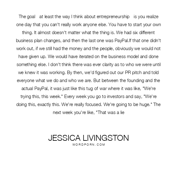 The goal - at least the way I think about entrepreneurship - is you realize one day that you can't really work anyone else. You have to start your own thing. It almost doesn't matter what the thing is. We had six different business plan changes, and then the last one was PayPal.If that one didn't work out, if we still had the money and the people, obviously we would not have given up. We would have iterated on the business model and done something else. I don't think there was ever clarity as to who we were until we knew it was working. By then, we'd figured out our PR pitch and told everyone what we do and who we are. But between the founding and the actual PayPal, it was just like this tug-of-war where it was like, "We're trying this, this week." Every week you go to investors and say, "We're doing this, exactly this. We're really focused. We're going to be huge." The next week you're like, "That was a lie