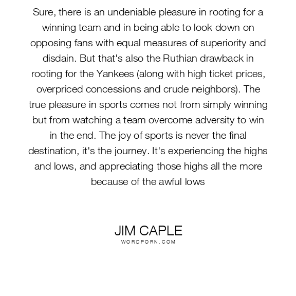 Sure, there is an undeniable pleasure in rooting for a winning team and in being able to look down on opposing fans with equal measures of superiority and disdain. But that's also the Ruthian drawback in rooting for the Yankees (along with high ticket prices, overpriced concessions and crude neighbors). The true pleasure in sports comes not from simply winning but from watching a team overcome adversity to win in the end. The joy of sports is never the final destination, it's the journey. It's experiencing the highs and lows, and appreciating those highs all the more because of the awful lows