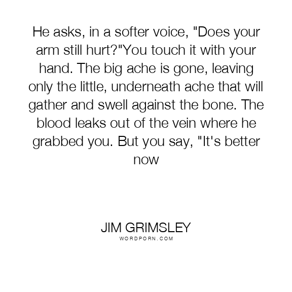 He asks, in a softer voice, "Does your arm still hurt?"You touch it with your hand. The big ache is gone, leaving only the little, underneath ache that will gather and swell against the bone. The blood leaks out of the vein where he grabbed you. But you say, "It's better now