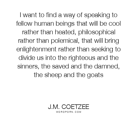I want to find a way of speaking to fellow human beings that will be cool rather than heated, philosophical rather than polemical, that will bring enlightenment rather than seeking to divide us into the righteous and the sinners, the saved and the damned, the sheep and the goats