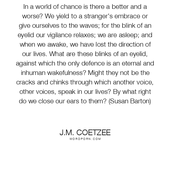 In a world of chance is there a better and a worse? We yield to a stranger's embrace or give ourselves to the waves; for the blink of an eyelid our vigilance relaxes; we are asleep; and when we awake, we have lost the direction of our lives. What are these blinks of an eyelid, against which the only defence is an eternal and inhuman wakefulness? Might they not be the cracks and chinks through which another voice, other voices, speak in our lives? By what right do we close our ears to them? (Susan Barton)