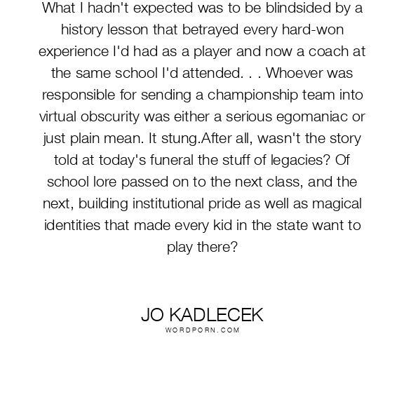 What I hadn't expected was to be blindsided by a history lesson that betrayed every hard-won experience I'd had as a player and now a coach at the same school I'd attended. . . Whoever was responsible for sending a championship team into virtual obscurity was either a serious egomaniac or just plain mean. It stung.After all, wasn't the story told at today's funeral the stuff of legacies? Of school lore passed on to the next class, and the next, building institutional pride as well as magical identities that made every kid in the state want to play there?