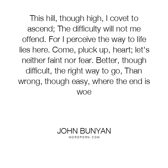 This hill, though high, I covet to ascend; The difficulty will not me offend. For I perceive the way to life lies here. Come, pluck up, heart; let's neither faint nor fear. Better, though difficult, the right way to go, Than wrong, though easy, where the end is woe