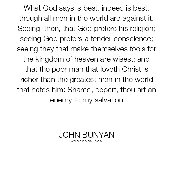 What God says is best, indeed is best, though all men in the world are against it. Seeing, then, that God prefers his religion; seeing God prefers a tender conscience; seeing they that make themselves fools for the kingdom of heaven are wisest; and that the poor man that loveth Christ is richer than the greatest man in the world that hates him: Shame, depart, thou art an enemy to my salvation