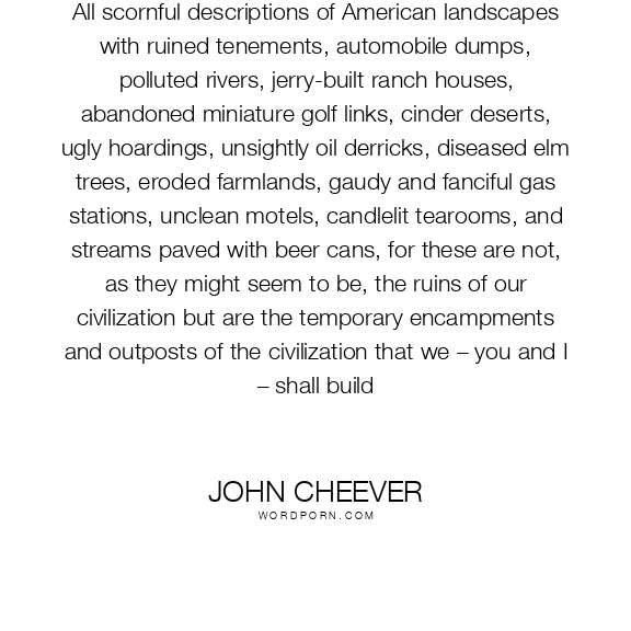 All scornful descriptions of American landscapes with ruined tenements, automobile dumps, polluted rivers, jerry-built ranch houses, abandoned miniature golf links, cinder deserts, ugly hoardings, unsightly oil derricks, diseased elm trees, eroded farmlands, gaudy and fanciful gas stations, unclean motels, candlelit tearooms, and streams paved with beer cans, for these are not, as they might seem to be, the ruins of our civilization but are the temporary encampments and outposts of the civilization that we – you and I – shall build