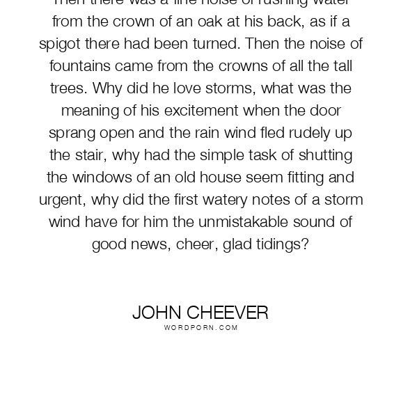 Then there was a fine noise of rushing water from the crown of an oak at his back, as if a spigot there had been turned. Then the noise of fountains came from the crowns of all the tall trees. Why did he love storms, what was the meaning of his excitement when the door sprang open and the rain wind fled rudely up the stair, why had the simple task of shutting the windows of an old house seem fitting and urgent, why did the first watery notes of a storm wind have for him the unmistakable sound of good news, cheer, glad tidings?