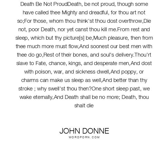 Death Be Not ProudDeath, be not proud, though some have called thee Mighty and dreadful, for thou art not so;For those, whom thou think'st thou dost overthrow,Die not, poor Death, nor yet canst thou kill me.From rest and sleep, which but thy picture[s] be,Much pleasure, then from thee much more must flow,And soonest our best men with thee do go,Rest of their bones, and soul's delivery.Thou'rt slave to Fate, chance, kings, and desperate men,And dost with poison, war, and sickness dwell,And poppy, or charms can make us sleep as well,And better than thy stroke ; why swell'st thou then?One short sleep past, we wake eternally,And Death shall be no more; Death, thou shalt die