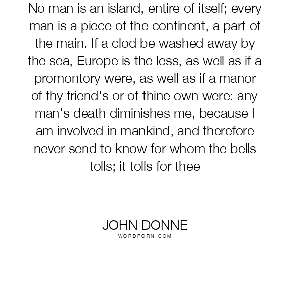 No man is an island, entire of itself; every man is a piece of the continent, a part of the main. If a clod be washed away by the sea, Europe is the less, as well as if a promontory were, as well as if a manor of thy friend's or of thine own were: any man's death diminishes me, because I am involved in mankind, and therefore never send to know for whom the bells tolls; it tolls for thee
