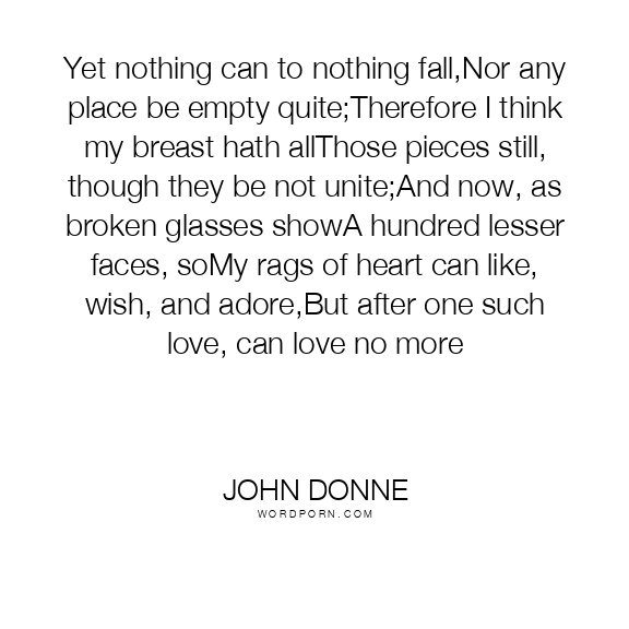 Yet nothing can to nothing fall,Nor any place be empty quite;Therefore I think my breast hath allThose pieces still, though they be not unite;And now, as broken glasses showA hundred lesser faces, soMy rags of heart can like, wish, and adore,But after one such love, can love no more