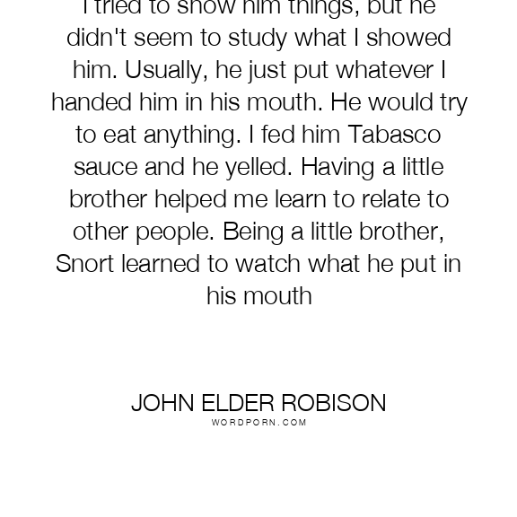 I tried to show him things, but he didn't seem to study what I showed him. Usually, he just put whatever I handed him in his mouth. He would try to eat anything. I fed him Tabasco sauce and he yelled. Having a little brother helped me learn to relate to other people. Being a little brother, Snort learned to watch what he put in his mouth