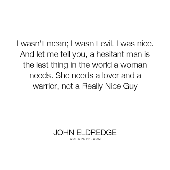 I wasn't mean; I wasn't evil. I was nice. And let me tell you, a hesitant man is the last thing in the world a woman needs. She needs a lover and a warrior, not a Really Nice Guy