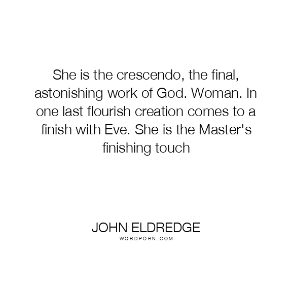She is the crescendo, the final, astonishing work of God. Woman. In one last flourish creation comes to a finish with Eve. She is the Master's finishing touch