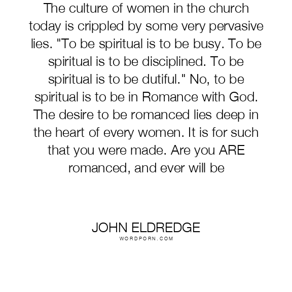 The culture of women in the church today is crippled by some very pervasive lies. "To be spiritual is to be busy. To be spiritual is to be disciplined. To be spiritual is to be dutiful." No, to be spiritual is to be in Romance with God. The desire to be romanced lies deep in the heart of every women. It is for such that you were made. Are you ARE romanced, and ever will be