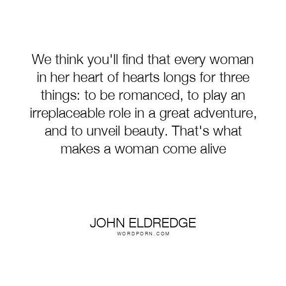 We think you'll find that every woman in her heart of hearts longs for three things: to be romanced, to play an irreplaceable role in a great adventure, and to unveil beauty. That's what makes a woman come alive