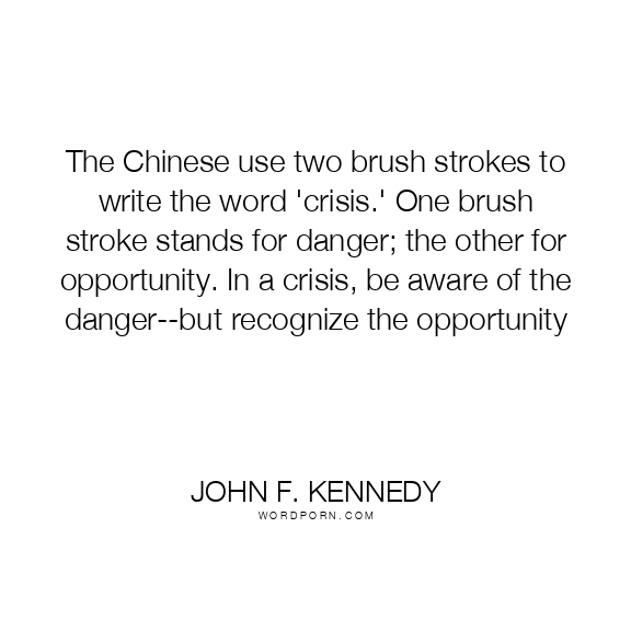 The Chinese use two brush strokes to write the word 'crisis.' One brush stroke stands for danger; the other for opportunity. In a crisis, be aware of the danger--but recognize the opportunity