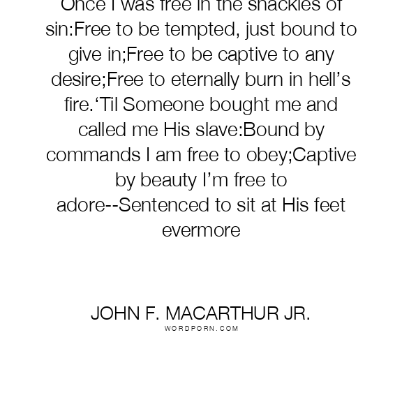 Once I was free in the shackles of sin:Free to be tempted, just bound to give in;Free to be captive to any desire;Free to eternally burn in hell’s fire.‘Til Someone bought me and called me His slave:Bound by commands I am free to obey;Captive by beauty I’m free to adore--Sentenced to sit at His feet evermore