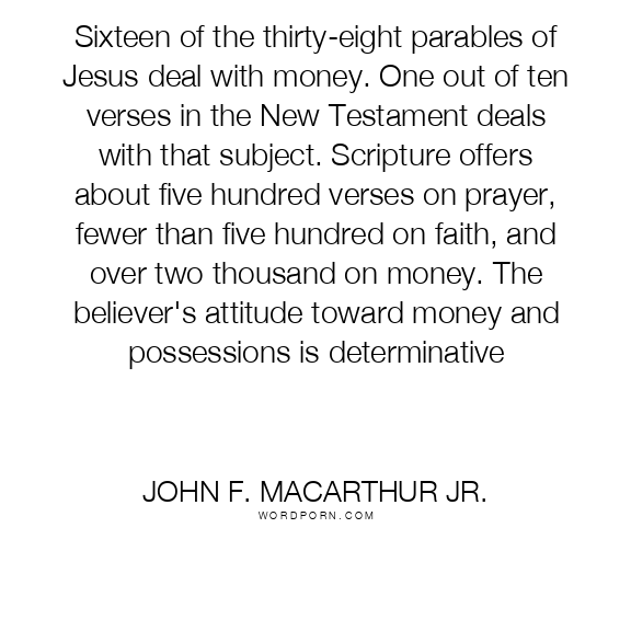 Sixteen of the thirty-eight parables of Jesus deal with money. One out of ten verses in the New Testament deals with that subject. Scripture offers about five hundred verses on prayer, fewer than five hundred on faith, and over two thousand on money. The believer's attitude toward money and possessions is determinative