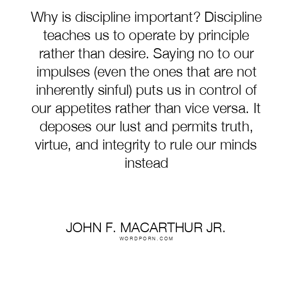 Why is discipline important? Discipline teaches us to operate by principle rather than desire. Saying no to our impulses (even the ones that are not inherently sinful) puts us in control of our appetites rather than vice versa. It deposes our lust and permits truth, virtue, and integrity to rule our minds instead