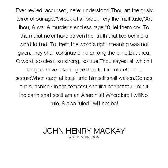Ever reviled, accursed, ne'er understood,Thou art the grisly terror of our age."Wreck of all order," cry the multitude,"Art thou, & war & murder's endless rage."0, let them cry. To them that ne'er have strivenThe 'truth that lies behind a word to find, To them the word's right meaning was not given.They shall continue blind among the blind.But thou, O word, so clear, so strong, so true,Thou sayest all which I for goal have taken.I give thee to the future! Thine secureWhen each at least unto himself shall waken.Comes it in sunshine? In the tempest's thrill?I cannot tell - but it the earth shall see!I am an Anarchist! Wherefore I willNot rule, & also ruled I will not be!