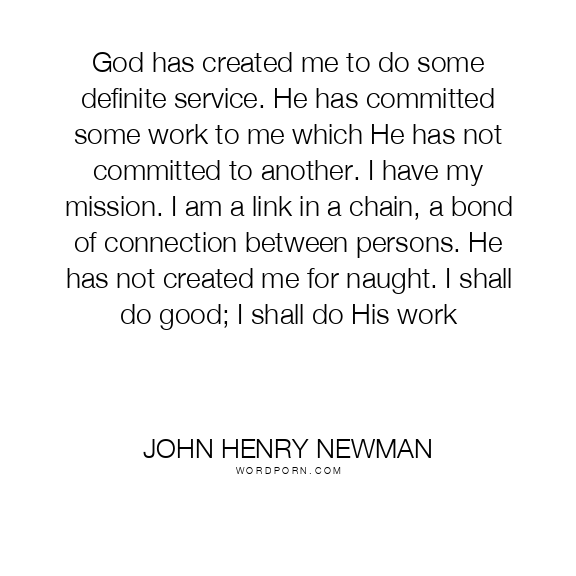 God has created me to do some definite service. He has committed some work to me which He has not committed to another. I have my mission. I am a link in a chain, a bond of connection between persons. He has not created me for naught. I shall do good; I shall do His work