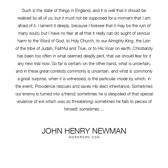 Such is the state of things in England, and it is well that it should be realised by all of us; but it must not be supposed for a moment that I am afraid of it. I lament it deeply, because I foresee that it may be the ruin of many souls; but I have no fear at all that it really can do aught of serious harm to the Word of God, to Holy Church, to our Almighty King, the Lion of the tribe of Judah, Faithful and True, or to His Vicar on earth. Christianity has been too often in what seemed deadly peril, that we should fear for it any new trial now. So far is certain; on the other hand, what is uncertain, and in these great contests commonly is uncertain, and what is commonly a great surprise, when it is witnessed, is the particular mode by which, in the event, Providence rescues and saves His elect inheritance. Sometimes our enemy is turned into a friend; sometimes he is despoiled of that special virulence of evil which was so threatening; sometimes he falls to pieces of himself; sometimes he does just so much as is beneficial, and then is removed. Commonly the Church has nothing more to do than to go on in her own proper duties, in confidence and peace; to stand still and to see the salvation of God