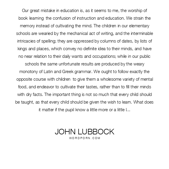 Our great mistake in education is, as it seems to me, the worship of book-learning–the confusion of instruction and education. We strain the memory instead of cultivating the mind. The children in our elementary schools are wearied by the mechanical act of writing, and the interminable intricacies of spelling; they are oppressed by columns of dates, by lists of kings and places, which convey no definite idea to their minds, and have no near relation to their daily wants and occupations; while in our public schools the same unfortunate results are produced by the weary monotony of Latin and Greek grammar. We ought to follow exactly the opposite course with children–to give them a wholesome variety of mental food, and endeavor to cultivate their tastes, rather than to fill their minds with dry facts. The important thing is not so much that every child should be taught, as that every child should be given the wish to learn. What does it matter if the pupil know a little more or a little less? A boy who leaves school knowing much, but hating his lessons, will soon have forgotten almost all he ever learned; while another who had acquired a thirst for knowledge, even if he had learned little, would soon teach himself more than the first ever knew