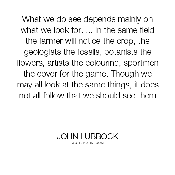 What we do see depends mainly on what we look for. ... In the same field the farmer will notice the crop, the geologists the fossils, botanists the flowers, artists the colouring, sportmen the cover for the game. Though we may all look at the same things, it does not all follow that we should see them