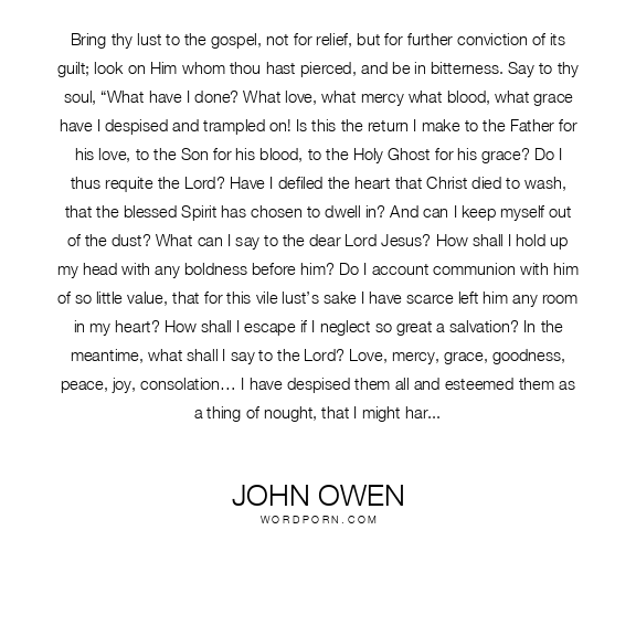 Bring thy lust to the gospel, not for relief, but for further conviction of its guilt; look on Him whom thou hast pierced, and be in bitterness. Say to thy soul, “What have I done? What love, what mercy what blood, what grace have I despised and trampled on! Is this the return I make to the Father for his love, to the Son for his blood, to the Holy Ghost for his grace? Do I thus requite the Lord? Have I defiled the heart that Christ died to wash, that the blessed Spirit has chosen to dwell in? And can I keep myself out of the dust? What can I say to the dear Lord Jesus? How shall I hold up my head with any boldness before him? Do I account communion with him of so little value, that for this vile lust’s sake I have scarce left him any room in my heart? How shall I escape if I neglect so great a salvation? In the meantime, what shall I say to the Lord? Love, mercy, grace, goodness, peace, joy, consolation… I have despised them all and esteemed them as a thing of nought, that I might harbor a lust in my heart. Have I obtained a view of God’s fatherly countenance, that I might behold his face and provoke him to his face? Was my soul washed, that room might be made for new defilements? Shall I endeavor to disappoint the end of the death of Christ? Shall I daily grieve that Spirit whereby I am sealed to the day of redemption?