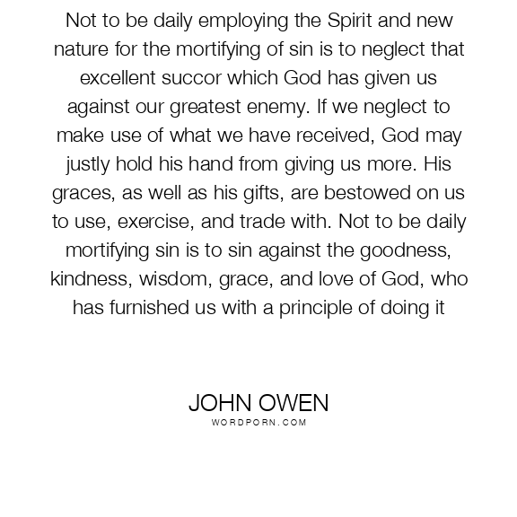 Not to be daily employing the Spirit and new nature for the mortifying of sin is to neglect that excellent succor which God has given us against our greatest enemy. If we neglect to make use of what we have received, God may justly hold his hand from giving us more. His graces, as well as his gifts, are bestowed on us to use, exercise, and trade with. Not to be daily mortifying sin is to sin against the goodness, kindness, wisdom, grace, and love of God, who has furnished us with a principle of doing it