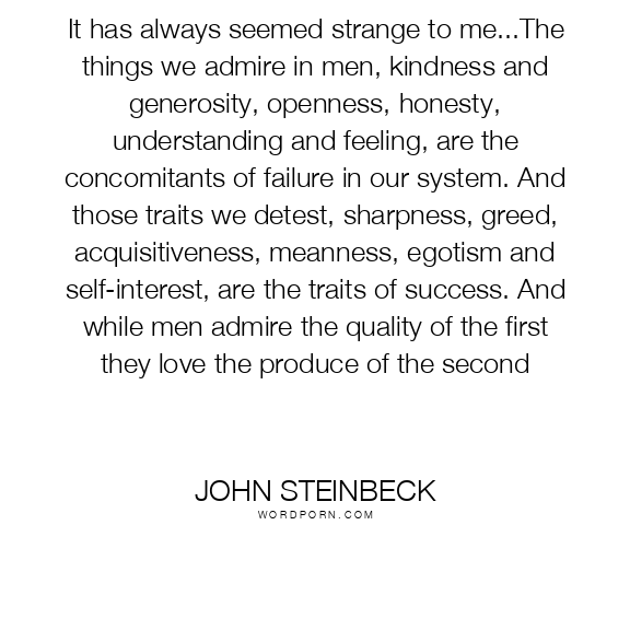 It has always seemed strange to me...The things we admire in men, kindness and generosity, openness, honesty, understanding and feeling, are the concomitants of failure in our system. And those traits we detest, sharpness, greed, acquisitiveness, meanness, egotism and self-interest, are the traits of success. And while men admire the quality of the first they love the produce of the second