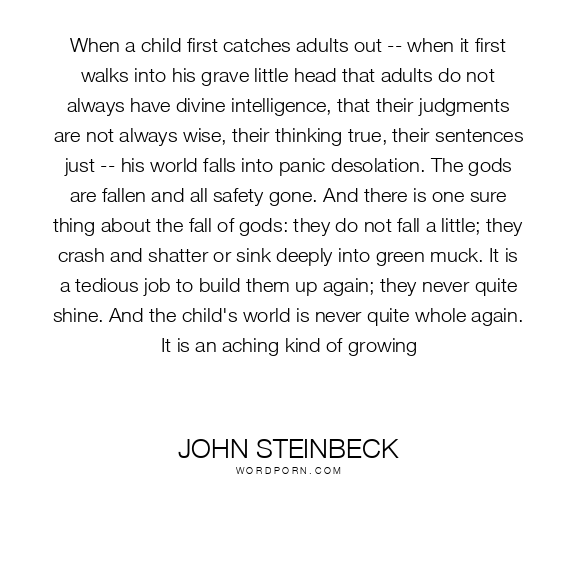 When a child first catches adults out -- when it first walks into his grave little head that adults do not always have divine intelligence, that their judgments are not always wise, their thinking true, their sentences just -- his world falls into panic desolation. The gods are fallen and all safety gone. And there is one sure thing about the fall of gods: they do not fall a little; they crash and shatter or sink deeply into green muck. It is a tedious job to build them up again; they never quite shine. And the child's world is never quite whole again. It is an aching kind of growing
