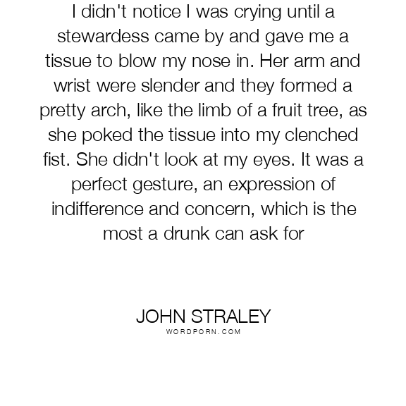 I didn't notice I was crying until a stewardess came by and gave me a tissue to blow my nose in. Her arm and wrist were slender and they formed a pretty arch, like the limb of a fruit tree, as she poked the tissue into my clenched fist. She didn't look at my eyes. It was a perfect gesture, an expression of indifference and concern, which is the most a drunk can ask for