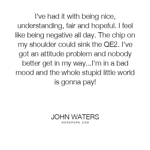 I've had it with being nice, understanding, fair and hopeful. I feel like being negative all day. The chip on my shoulder could sink the QE2. I've got an attitude problem and nobody better get in my way...I'm in a bad mood and the whole stupid little world is gonna pay!