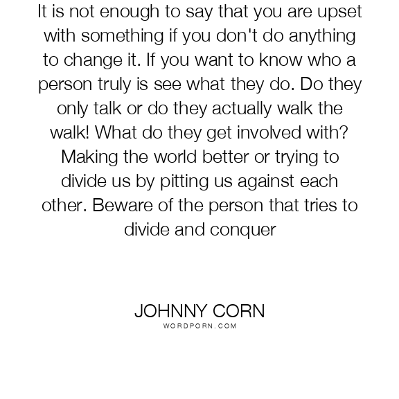 It is not enough to say that you are upset with something if you don't do anything to change it. If you want to know who a person truly is see what they do. Do they only talk or do they actually walk the walk! What do they get involved with? Making the world better or trying to divide us by pitting us against each other. Beware of the person that tries to divide and conquer
