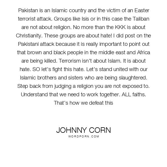 Pakistan is an Islamic country and the victim of an Easter terrorist attack. Groups like Isis or in this case the Taliban are not about religion. No more than the KKK is about Christianity. These groups are about hate! I did post on the Pakistani attack because it is really important to point out that brown and black people in the middle east and Africa are being killed. Terrorism isn't about Islam. It is about hate. SO let's fight this hate. Let's stand united with our Islamic brothers and sisters who are being slaughtered. Step back from judging a religion you are not exposed to. Understand that we need to work together. ALL faiths. That's how we defeat this