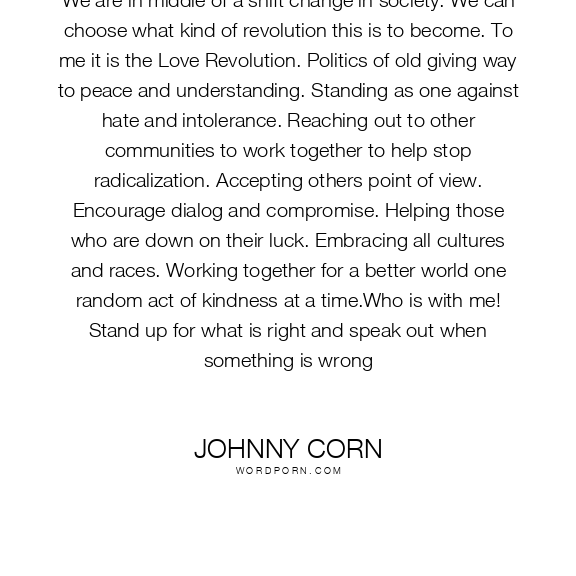 We are in middle of a shift change in society. We can choose what kind of revolution this is to become. To me it is the Love Revolution. Politics of old giving way to peace and understanding. Standing as one against hate and intolerance. Reaching out to other communities to work together to help stop radicalization. Accepting others point of view. Encourage dialog and compromise. Helping those who are down on their luck. Embracing all cultures and races. Working together for a better world one random act of kindness at a time.Who is with me! Stand up for what is right and speak out when something is wrong