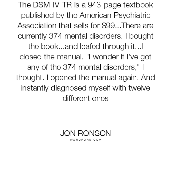 The DSM-IV-TR is a 943-page textbook published by the American Psychiatric Association that sells for $99...There are currently 374 mental disorders. I bought the book...and leafed through it...I closed the manual. "I wonder if I've got any of the 374 mental disorders," I thought. I opened the manual again. And instantly diagnosed myself with twelve different ones