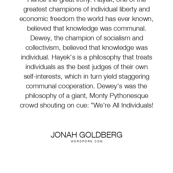 Hence the great irony: Hayek, one of the greatest champions of individual liberty and economic freedom the world has ever known, believed that knowledge was communal. Dewey, the champion of socialism and collectivism, believed that knowledge was individual. Hayek's is a philosophy that treats individuals as the best judges of their own self-interests, which in turn yield staggering communal cooperation. Dewey's was the philosophy of a giant, Monty Pythonesque crowd shouting on cue: "We're All Individuals!