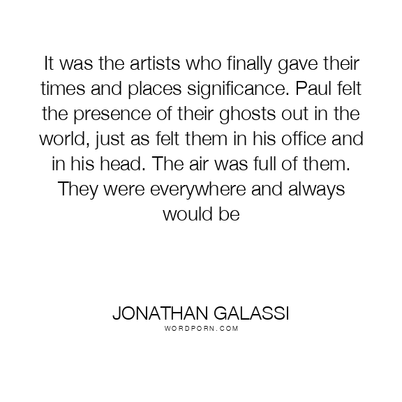 It was the artists who finally gave their times and places significance. Paul felt the presence of their ghosts out in the world, just as felt them in his office and in his head. The air was full of them. They were everywhere and always would be