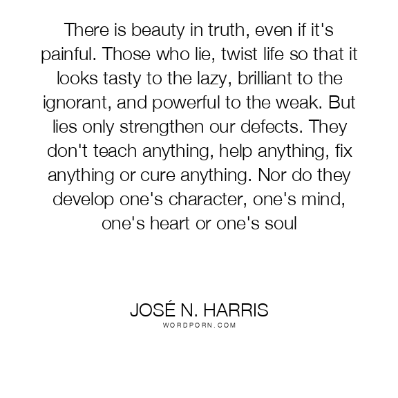 There is beauty in truth, even if it's painful. Those who lie, twist life so that it looks tasty to the lazy, brilliant to the ignorant, and powerful to the weak. But lies only strengthen our defects. They don't teach anything, help anything, fix anything or cure anything. Nor do they develop one's character, one's mind, one's heart or one's soul