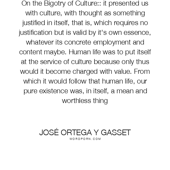 On the Bigotry of Culture:: it presented us with culture, with thought as something justified in itself, that is, which requires no justification but is valid by it's own essence, whatever its concrete employment and content maybe. Human life was to put itself at the service of culture because only thus would it become charged with value. From which it would follow that human life, our pure existence was, in itself, a mean and worthless thing