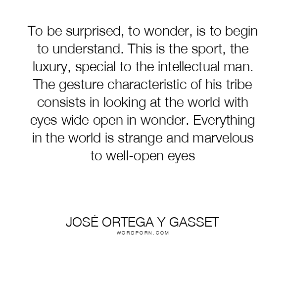 To be surprised, to wonder, is to begin to understand. This is the sport, the luxury, special to the intellectual man. The gesture characteristic of his tribe consists in looking at the world with eyes wide open in wonder. Everything in the world is strange and marvelous to well-open eyes