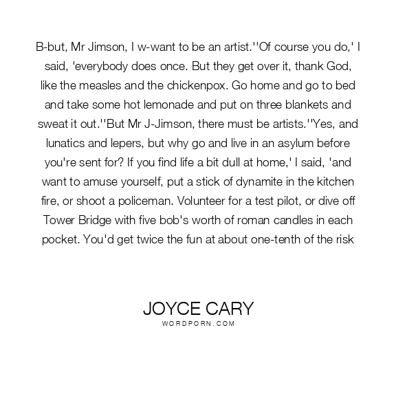B-but, Mr Jimson, I w-want to be an artist.''Of course you do,' I said, 'everybody does once. But they get over it, thank God, like the measles and the chickenpox. Go home and go to bed and take some hot lemonade and put on three blankets and sweat it out.''But Mr J-Jimson, there must be artists.''Yes, and lunatics and lepers, but why go and live in an asylum before you're sent for? If you find life a bit dull at home,' I said, 'and want to amuse yourself, put a stick of dynamite in the kitchen fire, or shoot a policeman. Volunteer for a test pilot, or dive off Tower Bridge with five bob's worth of roman candles in each pocket. You'd get twice the fun at about one-tenth of the risk