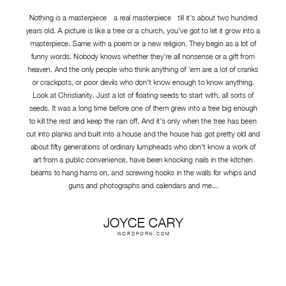 Nothing is a masterpiece - a real masterpiece - till it's about two hundred years old. A picture is like a tree or a church, you've got to let it grow into a masterpiece. Same with a poem or a new religion. They begin as a lot of funny words. Nobody knows whether they're all nonsense or a gift from heaven. And the only people who think anything of 'em are a lot of cranks or crackpots, or poor devils who don't know enough to know anything. Look at Christianity. Just a lot of floating seeds to start with, all sorts of seeds. It was a long time before one of them grew into a tree big enough to kill the rest and keep the rain off. And it's only when the tree has been cut into planks and built into a house and the house has got pretty old and about fifty generations of ordinary lumpheads who don't know a work of art from a public convenience, have been knocking nails in the kitchen beams to hang hams on, and screwing hooks in the walls for whips and guns and photographs and calendars and measuring the children on the window frames and chopping out a new cupboard under the stairs to keep the cheese and murdering their wives in the back room and burying them under the cellar flags, that it begins even to feel like a religion. And when the whole place is full of dry rot and ghosts and old bones and the shelves are breaking down with old wormy books that no one could read if they tried, and the attic floors are bulging through the servants' ceilings with old trunks and top-boots and gasoliers and dressmaker's dummies and ball frocks and dolls-houses and pony saddles and blunderbusses and parrot cages and uniforms and love letters and jugs without handles and bridal pots decorated with forget-me-nots and a piece out at the bottom, that it grows into a real old faith, a masterpiece which people can really get something out of, each for himself. And then, of course, everybody keeps on saying that it ought to be pulled down at once, because it's an insanitary nuisance