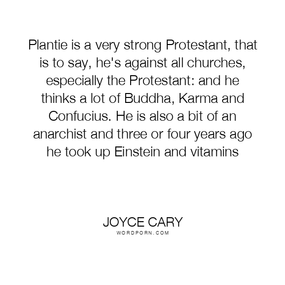 Plantie is a very strong Protestant, that is to say, he's against all churches, especially the Protestant: and he thinks a lot of Buddha, Karma and Confucius. He is also a bit of an anarchist and three or four years ago he took up Einstein and vitamins