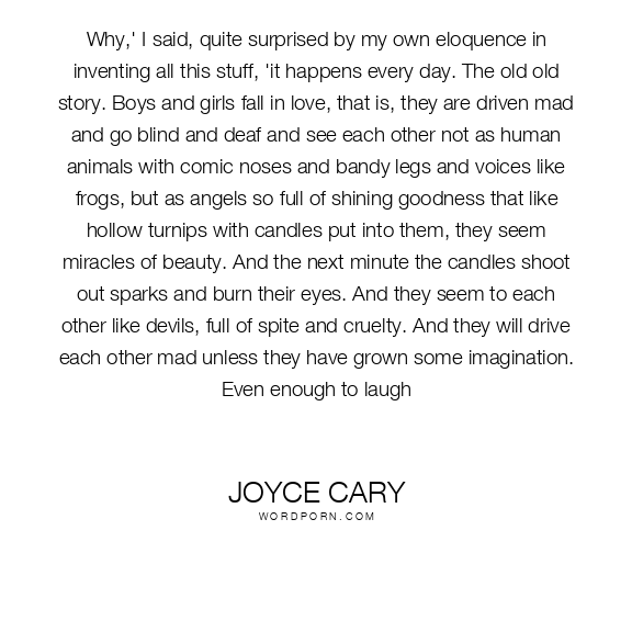 Why,' I said, quite surprised by my own eloquence in inventing all this stuff, 'it happens every day. The old old story. Boys and girls fall in love, that is, they are driven mad and go blind and deaf and see each other not as human animals with comic noses and bandy legs and voices like frogs, but as angels so full of shining goodness that like hollow turnips with candles put into them, they seem miracles of beauty. And the next minute the candles shoot out sparks and burn their eyes. And they seem to each other like devils, full of spite and cruelty. And they will drive each other mad unless they have grown some imagination. Even enough to laugh