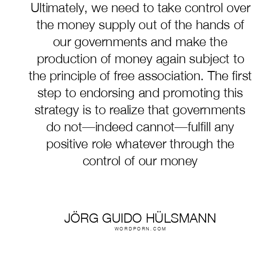 Ultimately, we need to take control over the money supply out of the hands of our governments and make the production of money again subject to the principle of free association. The first step to endorsing and promoting this strategy is to realize that governments do not—indeed cannot—fulfill any positive role whatever through the control of our money