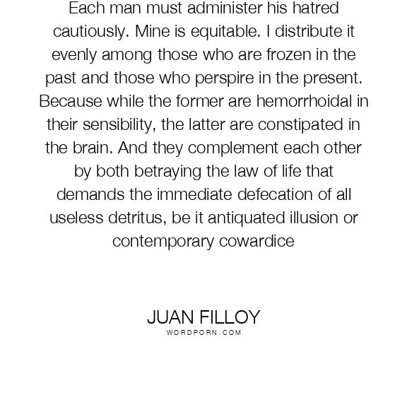 Each man must administer his hatred cautiously. Mine is equitable. I distribute it evenly among those who are frozen in the past and those who perspire in the present. Because while the former are hemorrhoidal in their sensibility, the latter are constipated in the brain. And they complement each other by both betraying the law of life that demands the immediate defecation of all useless detritus, be it antiquated illusion or contemporary cowardice