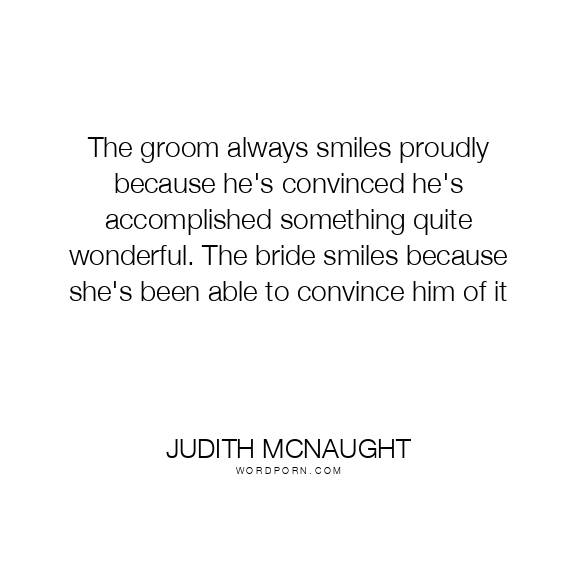 Judith McNaught quote. The groom always smiles proudly because he's convinced he's accomplished something quite wonderful. The bride smiles because she's been able to convince him of it